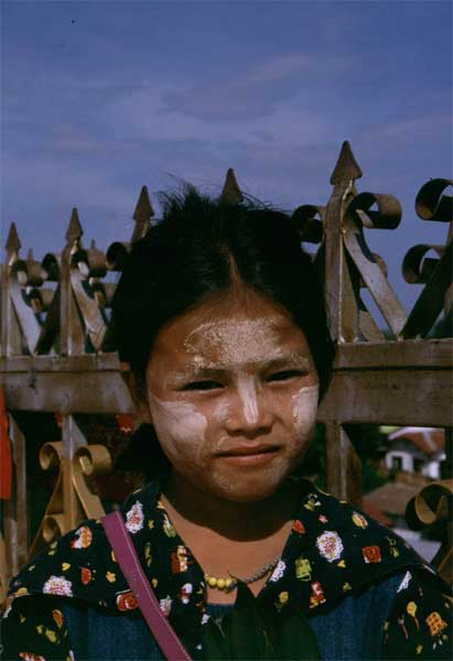 Giovane di Tachileik con la tipica cura del viso di terra di sandalo